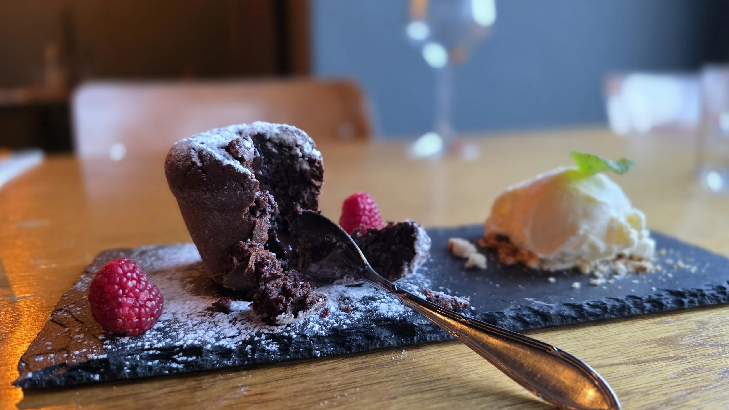 rucola, parmezaanflakes en coppa di parmaDesert: Lava cake